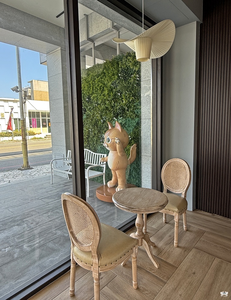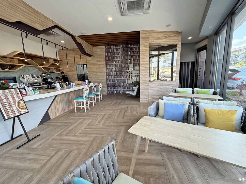 是有砸錢裝潢的花蓮貓咪咖啡館!木地板使用費工的人字拼,想要舒服的半戶外感可以選擇一樓靠窗,渡假風滿滿的編織扶手椅與多彩靠枕。