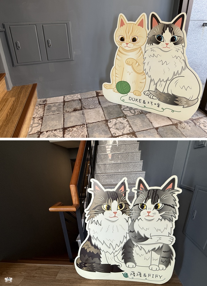 想看貓建議坐二樓,有電梯也可走樓梯。在轉角處都能看見Q版店貓。