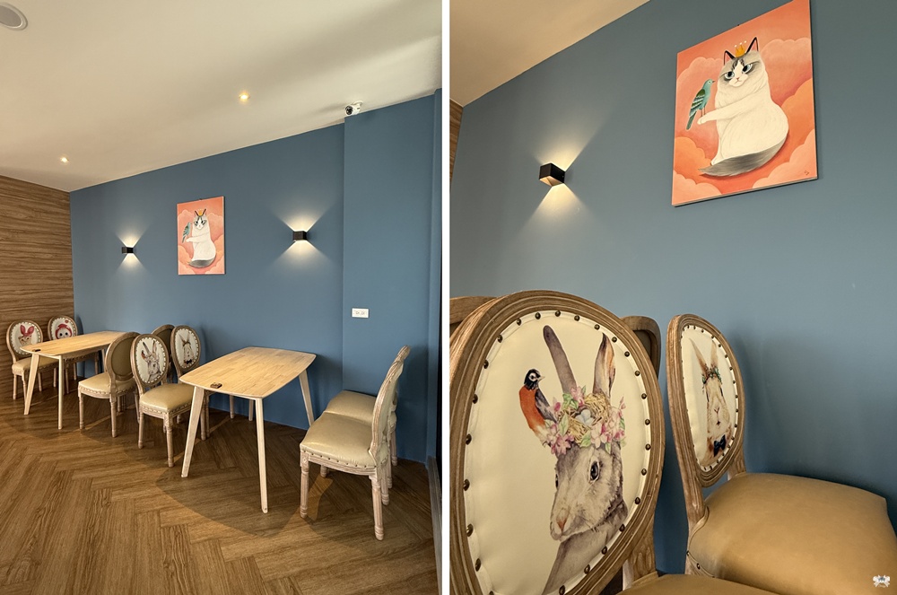 沉穩的灰藍色搭配木質空間,適度的淺藍色與可愛貓咪畫作點綴,彷彿是大人的外表下卻不小心外露了童心,就算再討厭難搞的事情進來渺渺後,都能稍微卸下這些煩人的瑣碎。