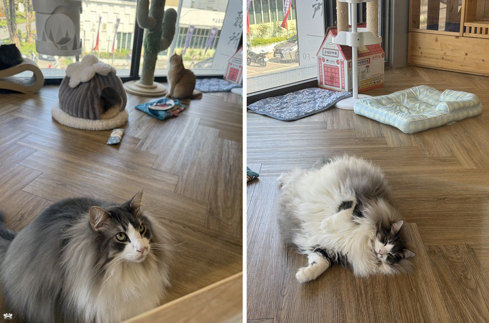 賞貓區是獨立的玻璃貓屋,兩面採光還有遮光捲簾幫貓咪擋熱,大約兩坪的面積剛剛好,提供貓咪流動飲水機與空氣清淨機,看的出來環境維持得很乾淨,貓咪們也都很慵懶自在,只有發現到玻璃窗外有個擠眉弄眼學貓叫的怪阿姨才會往我這邊看一下。